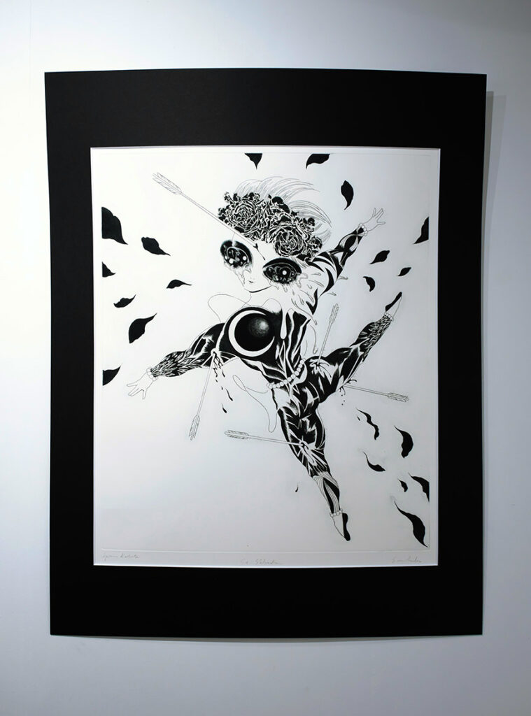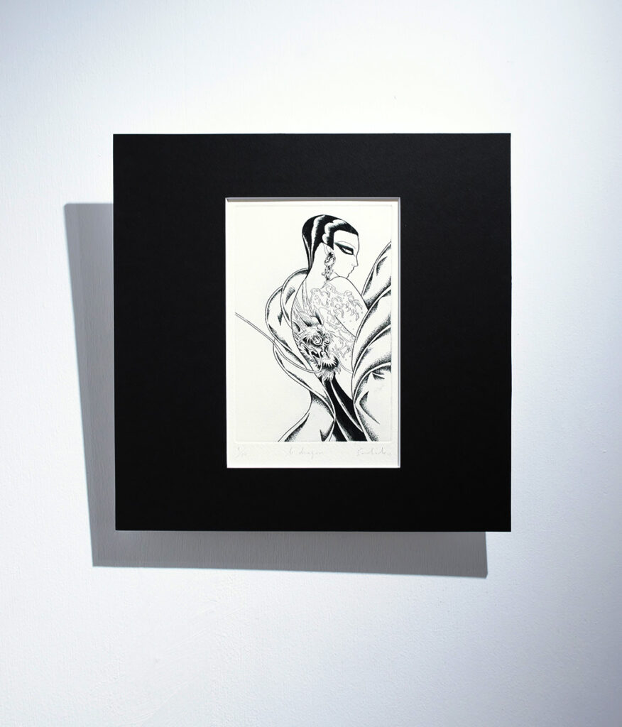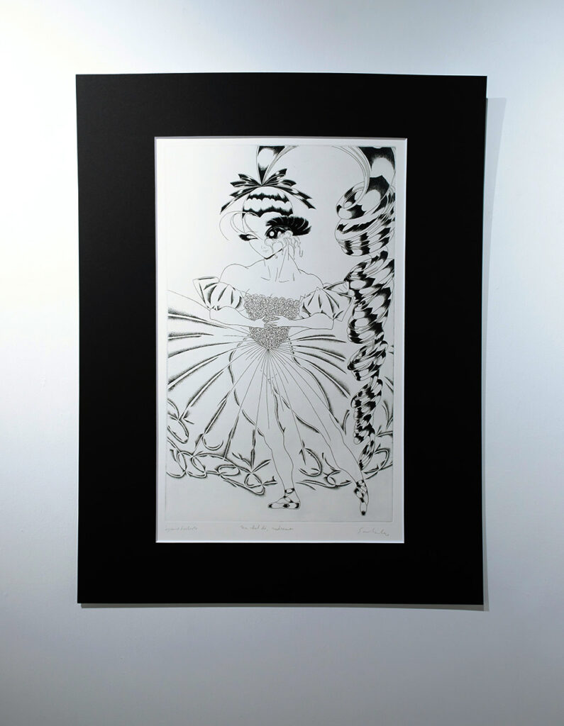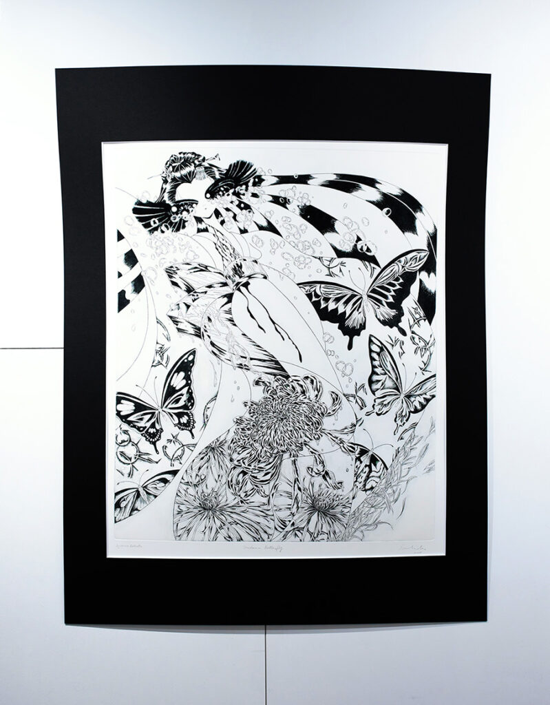 展覧会について:今回の展示作家である二宮さんは、銅版画の技術を使い、ジェンダー、フェミニズムに対する関心をテーマとした作品を展開しています。今回は、プッチーニの有名なオペラ「蝶々夫人」を題材にした表題作をはじめ、十数点を展示します。少女漫画に影響を受けた表現の技術面だけではなく、作品のコンセプトに注目しながら作品をみて頂けますと幸いです。