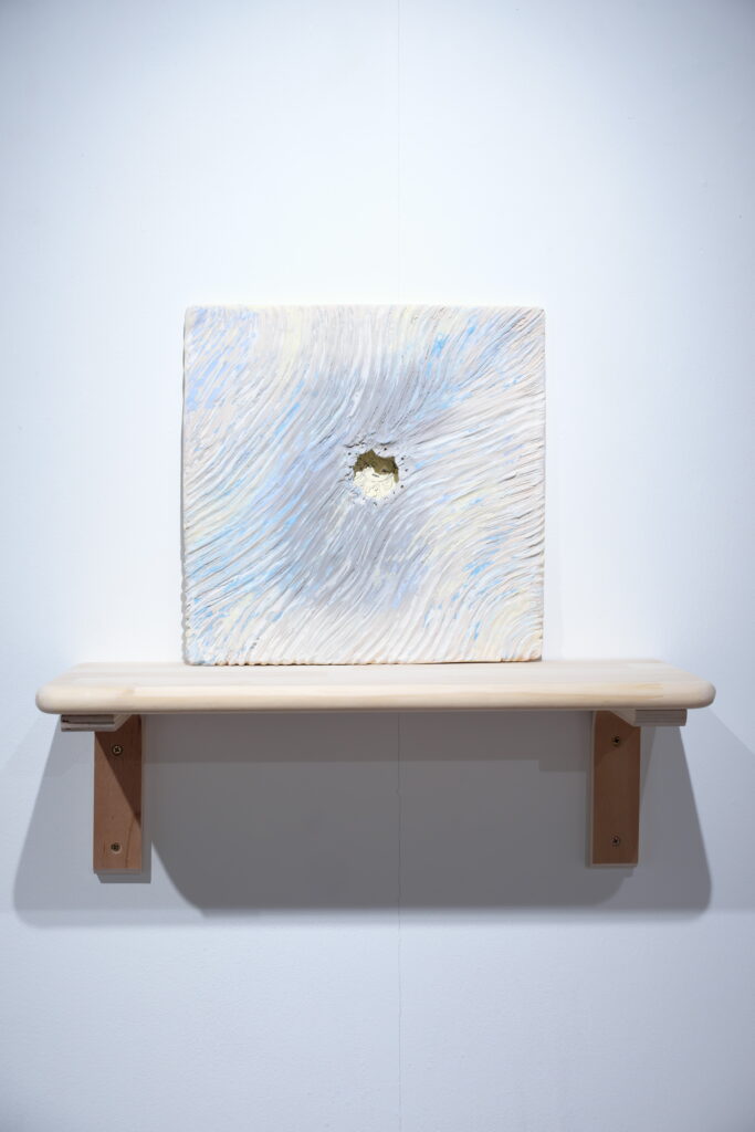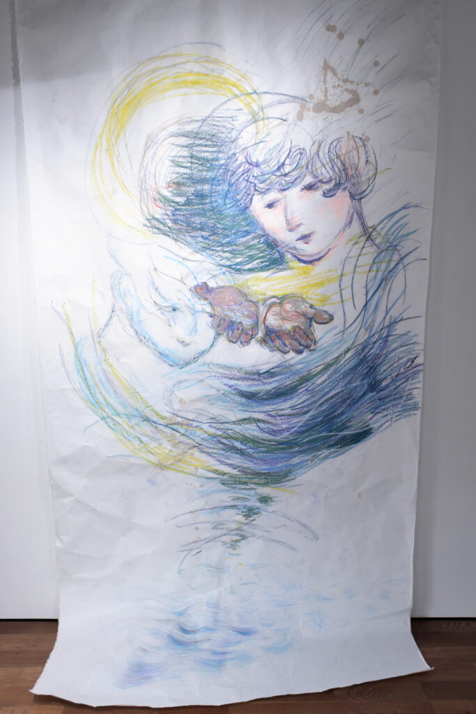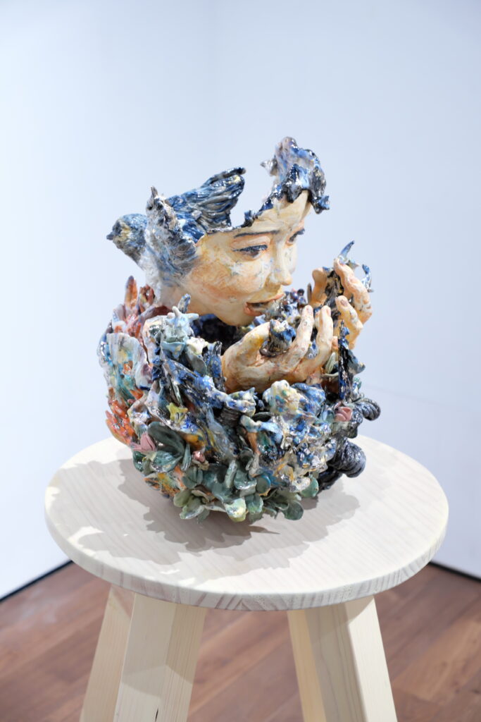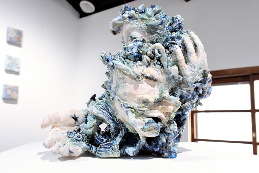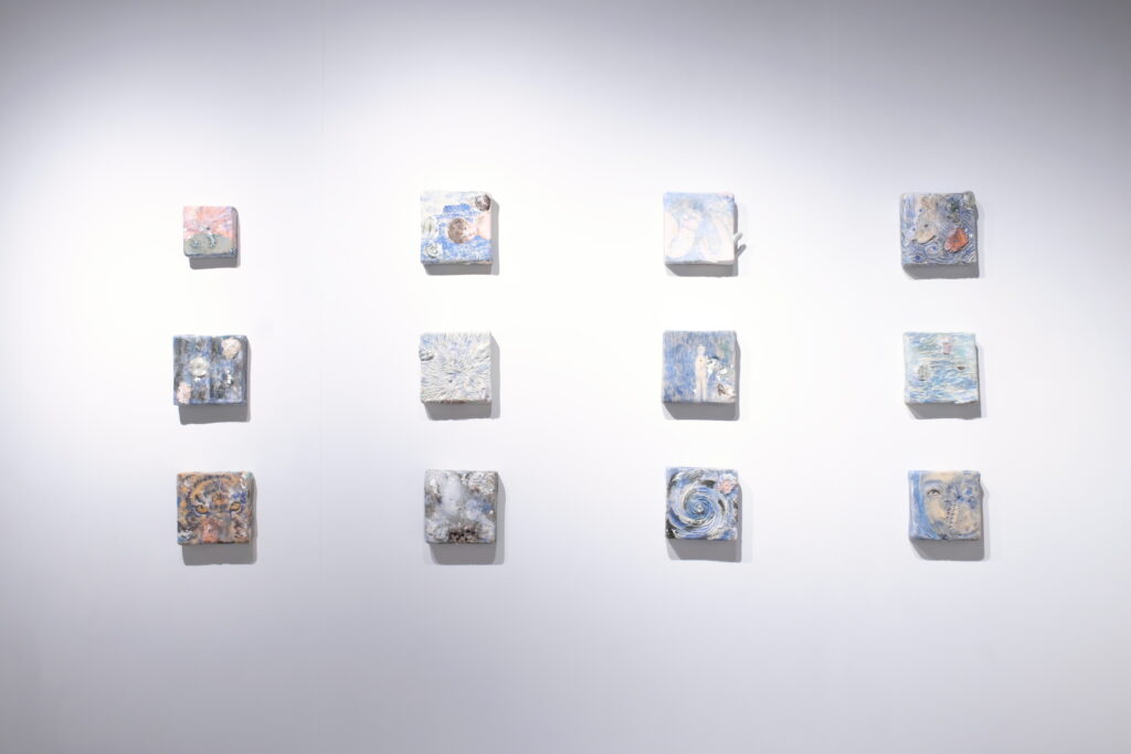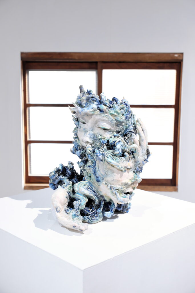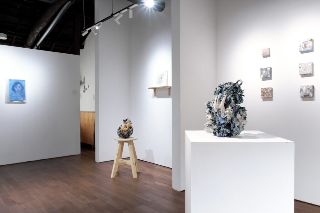 展覧会について:今回の展覧会タイトルは、韓国語で『ユンスル(윤슬)』という言葉です。その意味は太陽や月の光が水面に反射して輝くこと。今回の作家である森本さんは、社会に出て『ユンスル(윤슬)』という言葉の意味について自分なりの解釈をし、自身の人生と重ね合わせ、作品に昇華させている。本展では、陶表現とともにスケッチの展示を予定している。