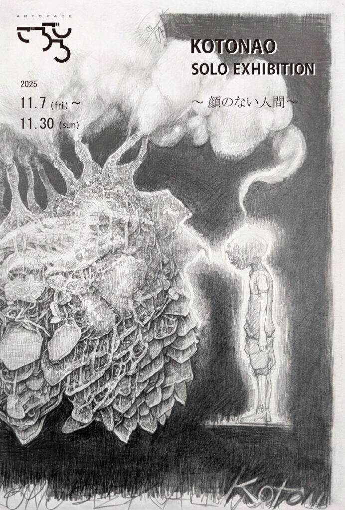 展覧会について:外界の情報を受け、自身のフィルターを通してアウトプットし続けている KOTONAO さん。絵を描く行為を続けている理由には、子どもの頃の恩師との思い出やふるさとで過ごした記憶が大きい。退廃した世界を描くことで現代社会に希望と絶望の警鐘を鳴らす。